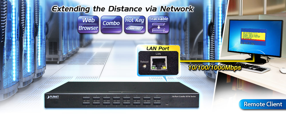 PLANET cung cấp giải pháp Switch KVM qua mạng IP có 8 cổng hoặc 16 cổng gắn Rack lý tưởng cho doanh nghiệp, phòng máy chủ hoặc cơ sở thử nghiệm. Với công nghệ IP tiên tiến, PLANET đã biến các Switch KVM truyền thống thành thiết bị mạng thực thụ. Thiết bị chuyển mạc\h PLANET IKVM-210-08 và IKVM-210-16 sử dụng bàn phím và chuột qua mạng IP, dễ dàng đồng thời truy cập nhiều điểm từ xa cùng lúc.