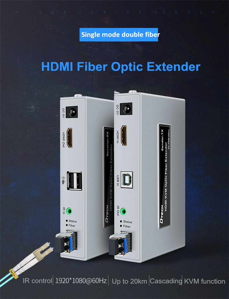 Bộ kéo dài HDMI USB-KVM qua cáp quang DTECH DT-7059được thiết kế để truyền tín hiệu video 1920*1080p@60Hz trên khoảng cách xa, thông thường lên đến 20km (tiêu chuẩn) hoặc lên đến 80km (tùy thuộc vào mô-đun SFP quang học được sử dụng). DTECH DT-7059 có cổng USB, giúp người dùng dễ dàng điều khiển chuột/bàn phím ở khoảng cách xa qua cáp sợi quang, dùng trong các các ứng dụng truyền dẫn HDMI ở khoảng cách xa như biển báo kỹ thuật số, hệ thống an ninh, tổ chức sự kiện âm thanh hình ảnh, quảng cáo kỹ thuật số và màn hình lớn.