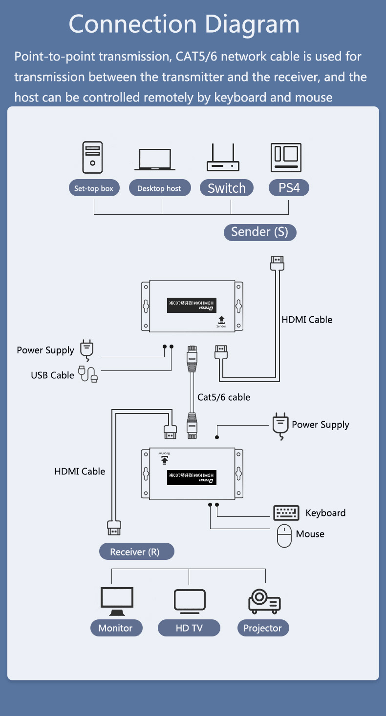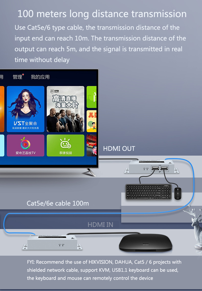 - Mở rộng HDMI: Mở rộng tín hiệu HDMI lên đến 100 mét bằng cáp Cat5e/Cat6.